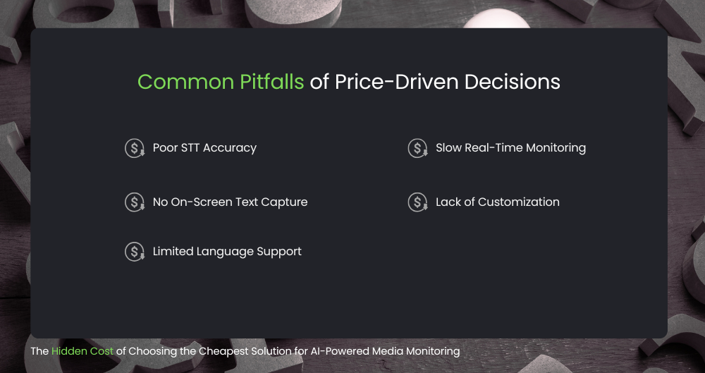 Choosing a solution purely on price can introduce hidden costs, such as missed content, reduced accuracy, and more time spent cleaning up poor data. Common issues include: