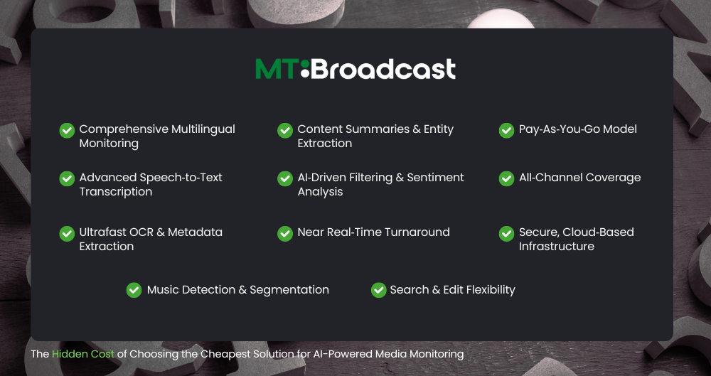 With MT Broadcast, you get exactly what you need—high-quality, focused coverage without the noise, delays, or extra manual work. It’s not just about saving money—it’s about gaining clarity, speed, and smarter insights that drive results.